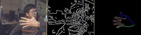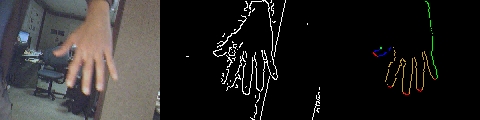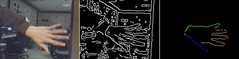 Here are five video sequences showing tracking results. Click on each image to play the entire video sequence. The left part shows the original image, the middle part shows the result of edge detection (where we combine a Canny edge detector and a binary classifier trained to recognize foreground edges based on skin color), and the right part shows the detection/registration result, where different colors are used for features matched to different states.